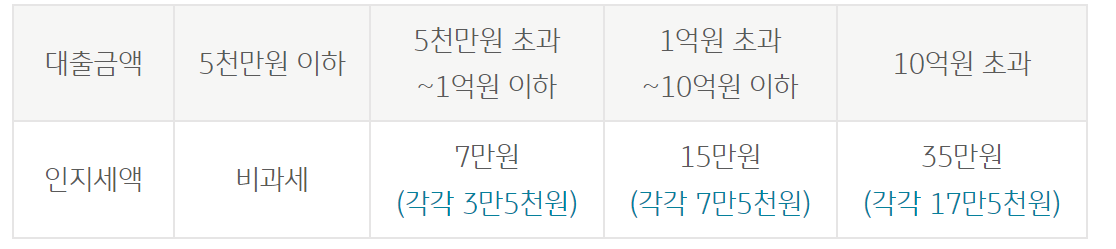 (1) 인지세 : 「인지세법」에 의해 대출약정 체결을 할 때 납부하는 세금으로 대출금액에 따라 세액이 차등 적용되며, 각 50%씩 고객과 은행이 부담