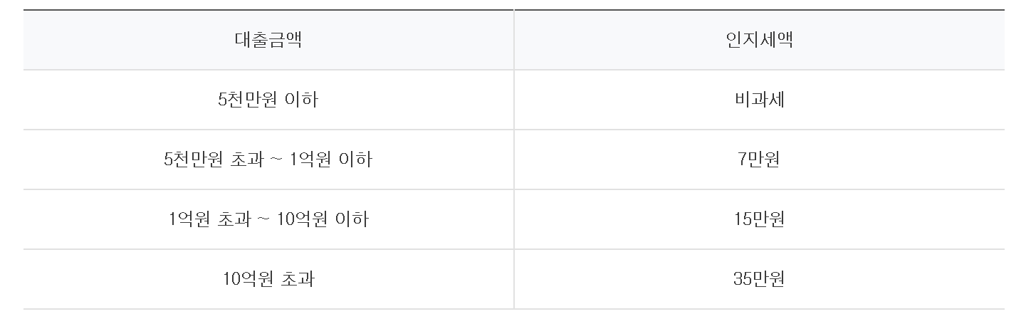 - 인지세 : 인지세법에 의해 대출약정 체결 시 납부하는 세금으로 대출금액에 따라 세액이 차등 적용되며, 은행과 손님이 각 50%씩 부담합니다.